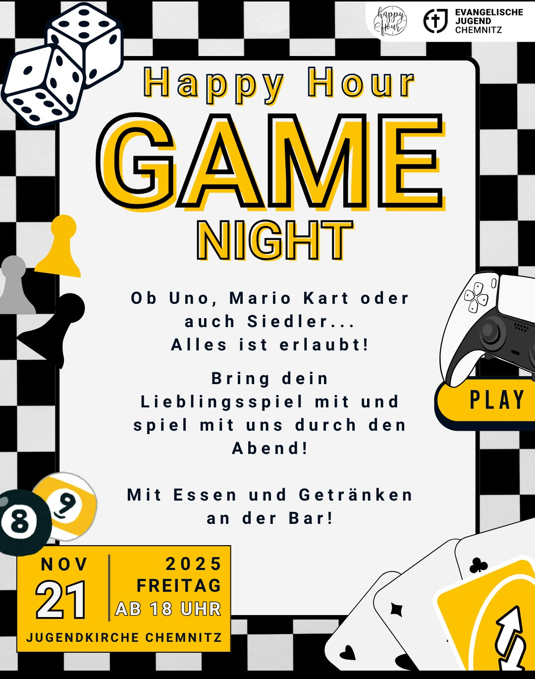 Bei der Happy Hour kannst du neue Leute kennenlernen, Gemeinschaft erleben, dich bei Aktionen ausprobieren oder auch einfach mal abhängen und chillen. Jedes mal erwartet dich etwas Neues - bleib auf dem Laufenden! ;)