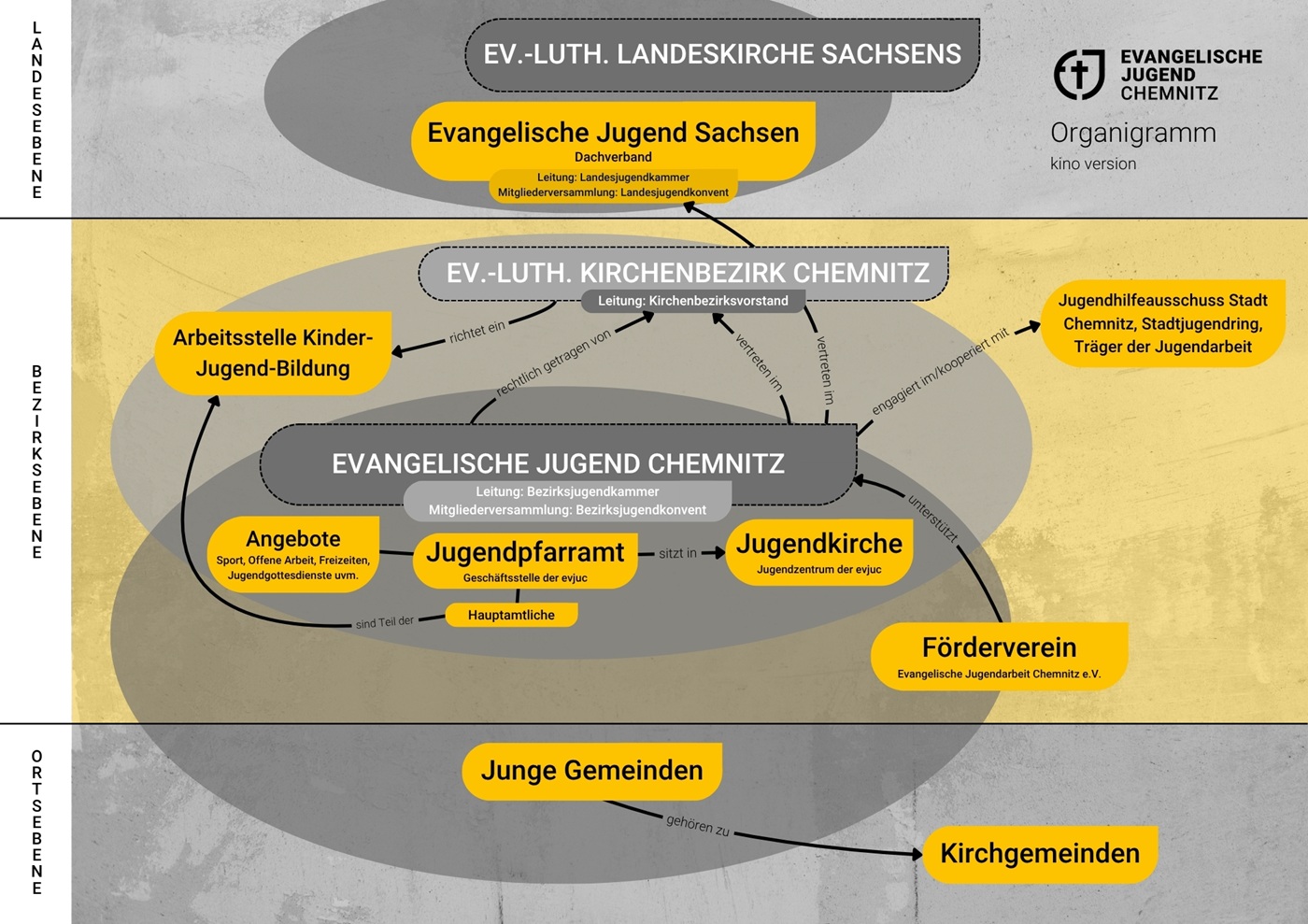 Die Evangelische Jugend Chemnitz (evjuc) ist ein Jugendverband im Ev.-Luth. Kirchenbezirk Chemnitz. Zu uns gehören etwa 30 Junge Gemeinden in Chemnitz und Umgebung. Das Jugendpfarramt ist die Geschäftsstelle der evjuc. Es befindet sich in der Jugendkirche - im Zentrum der Stadt.